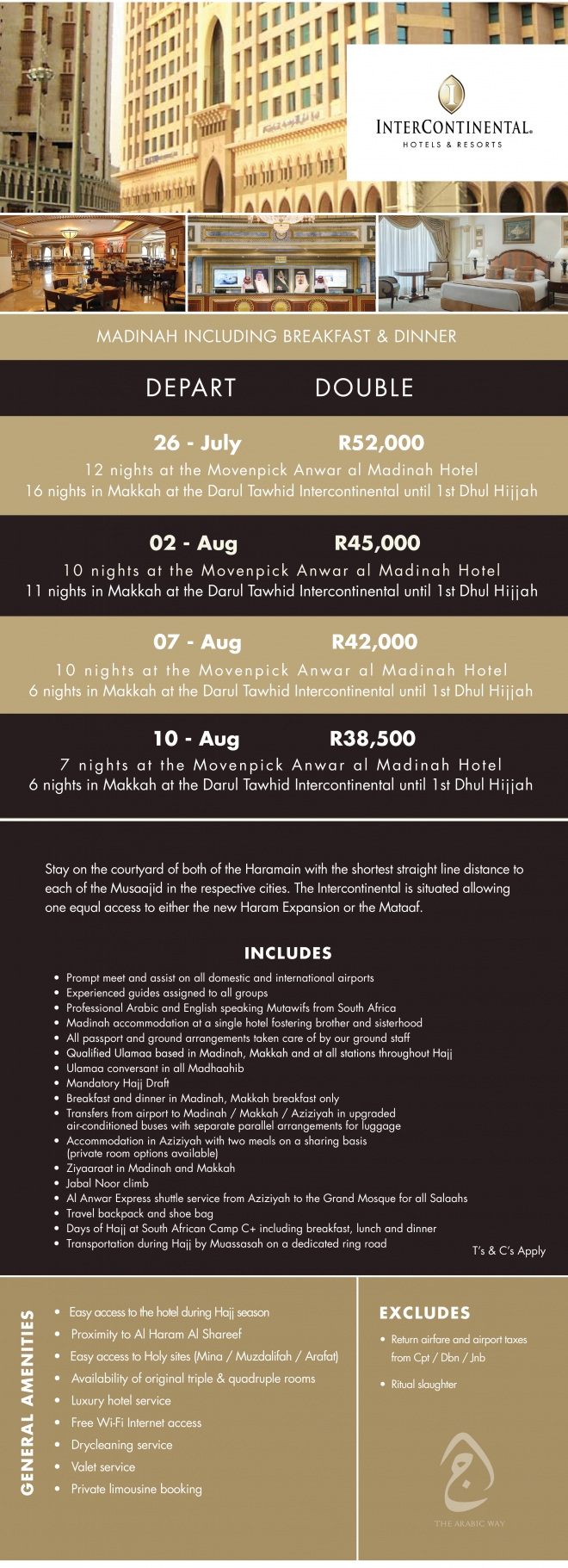 Disclaimer: Kindly check and confirm details with operators before booking. Package Information has been uploaded onto our website as received, and may have changed. Hotel Information has been sourced from websites like Google Maps, Wikimapia and Hotels.com. If any of the information is incorrect, kindly let us know via email: info@hajjumrahinfo.co.za - Shukran