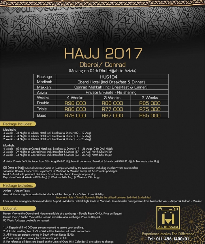 Disclaimer: Kindly check and confirm details with operators before booking. Package Information has been uploaded onto our website as received, and may have changed. Hotel Information has been sourced from websites like Google Maps, Wikimapia and Hotels.com. If any of the information is incorrect, kindly let us know via email: info@hajjumrahinfo.co.za - Shukran