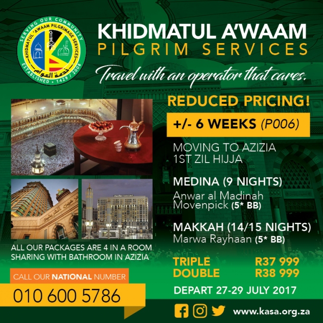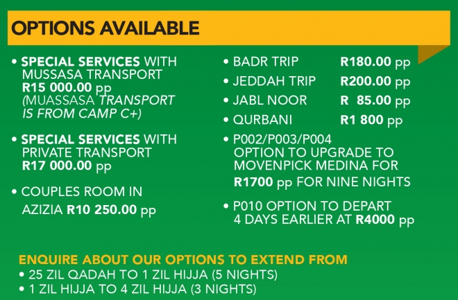 Disclaimer: Kindly check and confirm details with operators before booking. Package Information has been uploaded onto our website as received, and may have changed. Hotel Information has been sourced from websites like Google Maps, Wikimapia and Hotels.com. If any of the information is incorrect, kindly let us know via email: info@hajjumrahinfo.co.za - Shukran