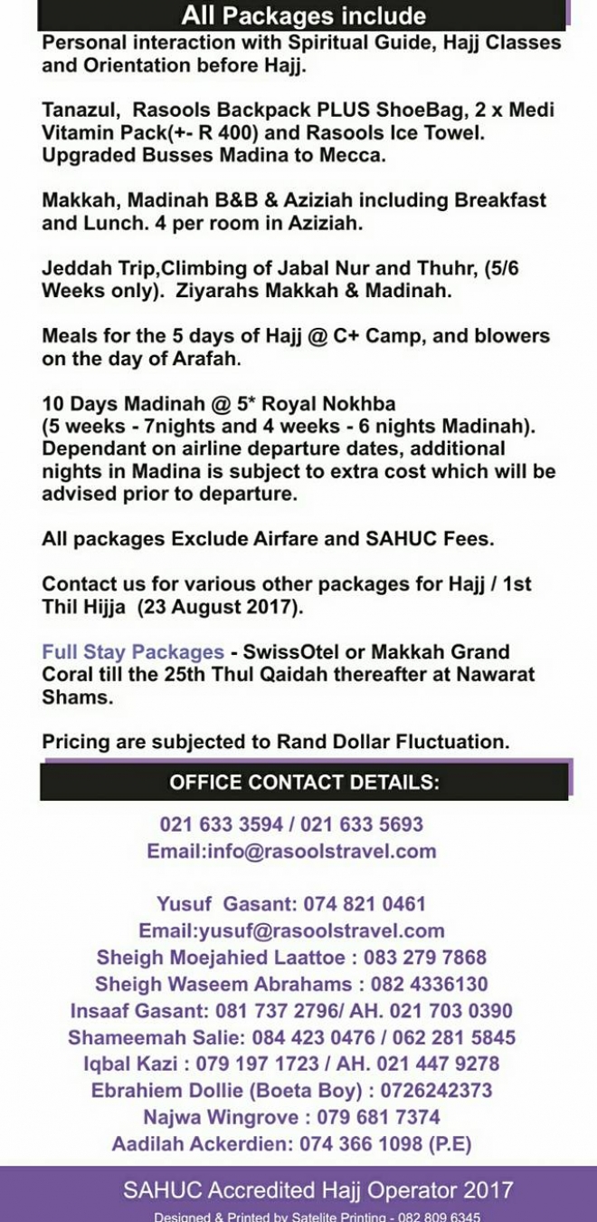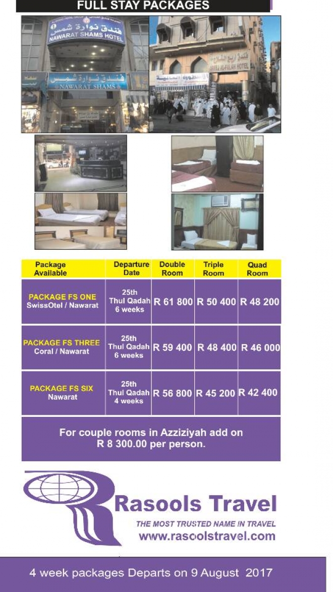 Disclaimer: Kindly check and confirm details with operators before booking. Package Information has been uploaded onto our website as received, and may have changed. Hotel Information has been sourced from websites like Google Maps, Wikimapia and Hotels.com. If any of the information is incorrect, kindly let us know via email: info@hajjumrahinfo.co.za - Shukran