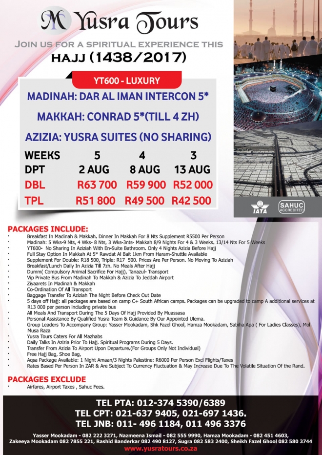 Disclaimer: Kindly check and confirm details with operators before booking. Package Information has been uploaded onto our website as received, and may have changed. Hotel Information has been sourced from websites like Google Maps, Wikimapia and Hotels.com. If any of the information is incorrect, kindly let us know via email: info@hajjumrahinfo.co.za - Shukran