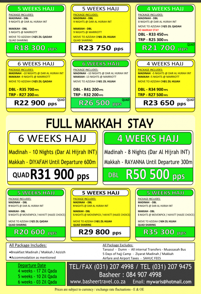 Disclaimer: Kindly check and confirm details with operators before booking. Package Information has been uploaded onto our website as received, and may have changed. Hotel Information has been sourced from websites like Google Maps, Wikimapia and Hotels.com. If any of the information is incorrect, kindly let us know via email: info@hajjumrahinfo.co.za - Shukran