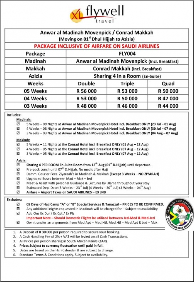 Disclaimer: Kindly check and confirm details with operators before booking. Package Information has been uploaded onto our website as received, and may have changed. Hotel Information has been sourced from websites like Google Maps, Wikimapia and Hotels.com. If any of the information is incorrect, kindly let us know via email: info@hajjumrahinfo.co.za - Shukran