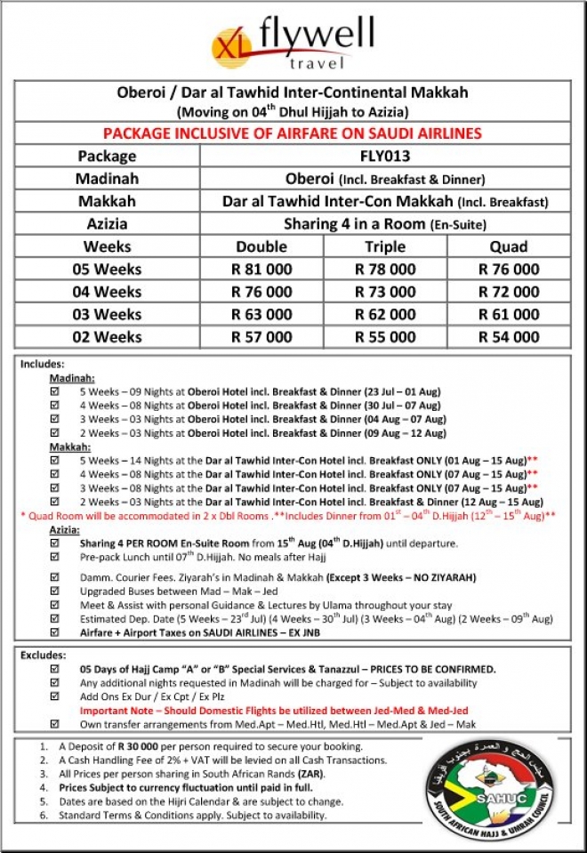Disclaimer: Kindly check and confirm details with operators before booking. Package Information has been uploaded onto our website as received, and may have changed. Hotel Information has been sourced from websites like Google Maps, Wikimapia and Hotels.com. If any of the information is incorrect, kindly let us know via email: info@hajjumrahinfo.co.za - Shukran