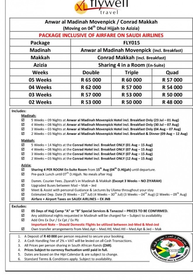 Disclaimer: Kindly check and confirm details with operators before booking. Package Information has been uploaded onto our website as received, and may have changed. Hotel Information has been sourced from websites like Google Maps, Wikimapia and Hotels.com. If any of the information is incorrect, kindly let us know via email: info@hajjumrahinfo.co.za - Shukran