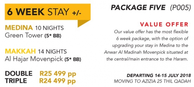 Our value offer has the most exible 6 week package, with the option of upgrading your stay in Medina to the Shaza Al Madina Hotel situated at the central/main entrance to the Haram.