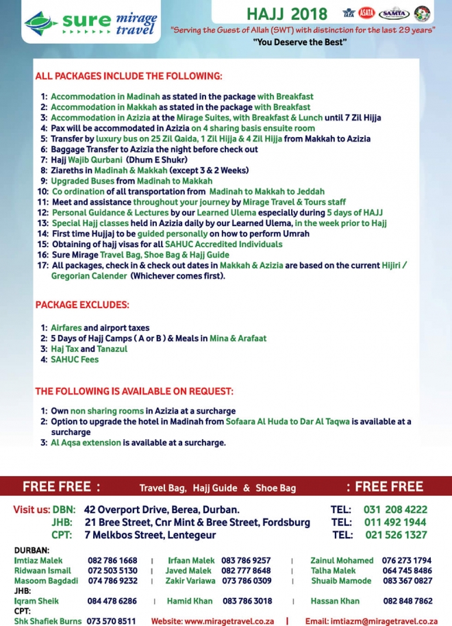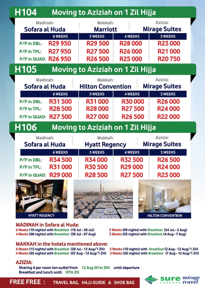 Disclaimer: Kindly check and confirm details with operators before booking. Package Information has been uploaded onto our website as received, and may have changed. Hotel Information has been sourced from websites like Google Maps, Wikimapia and Hotels.com. If any of the information is incorrect, kindly let us know via email: info@hajjumrahinfo.co.za - Shukran