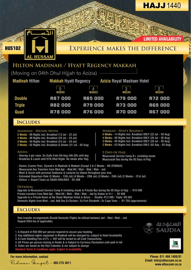 Disclaimer: Kindly check and confirm details with operators before booking. Package Information has been uploaded onto our website as received, and may have changed. Hotel Information has been sourced from websites like Google Maps, Wikimapia and Hotels.com. If any of the information is incorrect, kindly let us know via email: info@hajjumrahinfo.co.za - Shukran