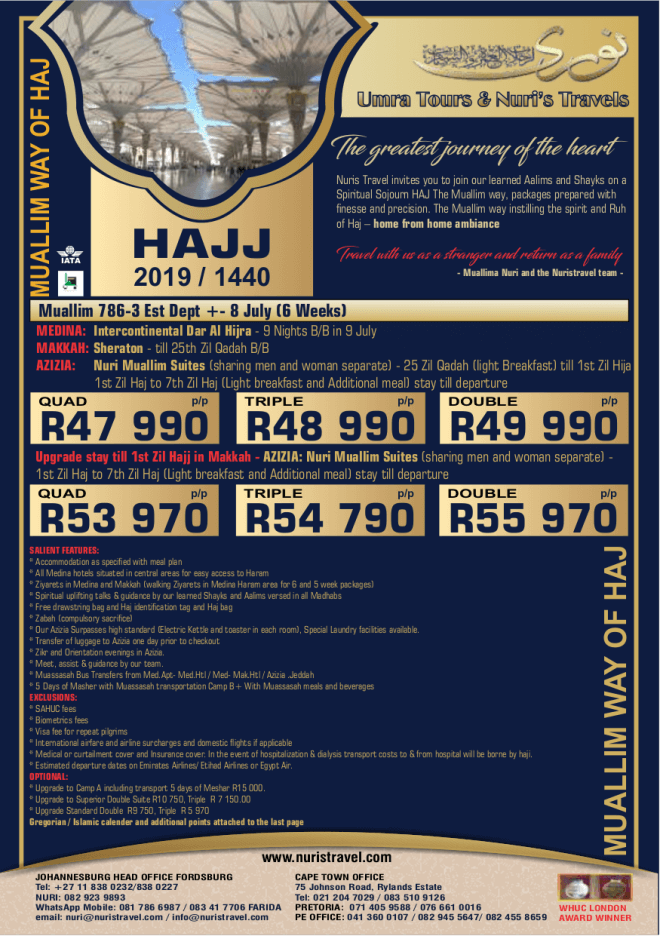 Disclaimer: Kindly check and confirm details with operators before booking. Package Information has been uploaded onto our website as received, and may have changed. Hotel Information has been sourced from websites like Google Maps, Wikimapia and Hotels.com. If any of the information is incorrect, kindly let us know via email: info@hajjumrahinfo.co.za - Shukran