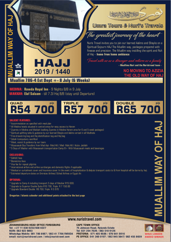 Disclaimer: Kindly check and confirm details with operators before booking. Package Information has been uploaded onto our website as received, and may have changed. Hotel Information has been sourced from websites like Google Maps, Wikimapia and Hotels.com. If any of the information is incorrect, kindly let us know via email: info@hajjumrahinfo.co.za - Shukran