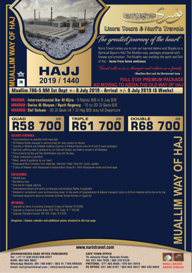 Disclaimer: Kindly check and confirm details with operators before booking. Package Information has been uploaded onto our website as received, and may have changed. Hotel Information has been sourced from websites like Google Maps, Wikimapia and Hotels.com. If any of the information is incorrect, kindly let us know via email: info@hajjumrahinfo.co.za - Shukran