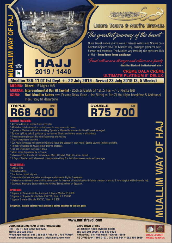 Disclaimer: Kindly check and confirm details with operators before booking. Package Information has been uploaded onto our website as received, and may have changed. Hotel Information has been sourced from websites like Google Maps, Wikimapia and Hotels.com. If any of the information is incorrect, kindly let us know via email: info@hajjumrahinfo.co.za - Shukran