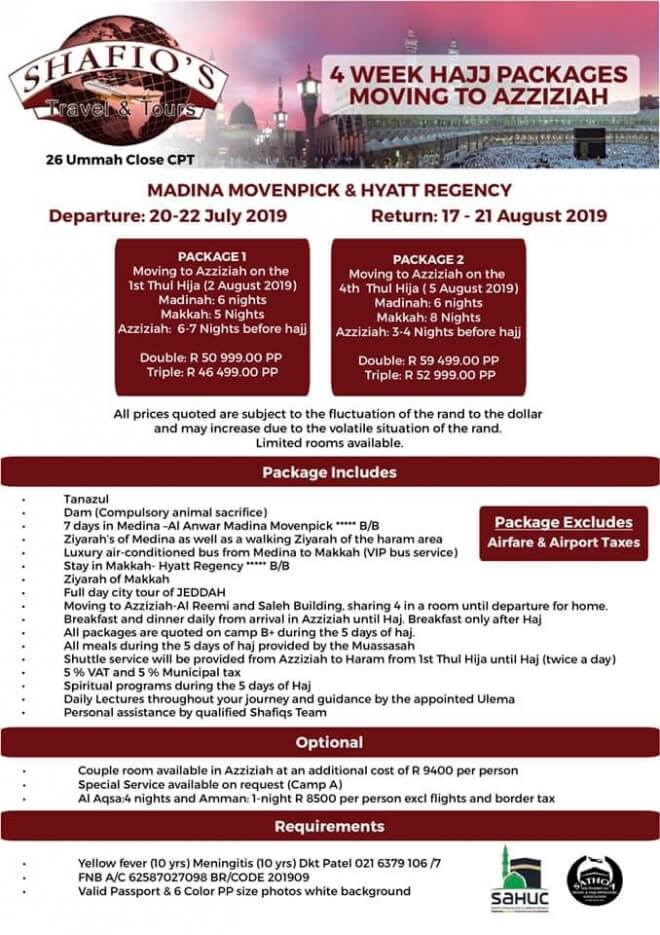 Disclaimer: Kindly check and confirm details with operators before booking. Package Information has been uploaded onto our website as received, and may have changed. Hotel Information has been sourced from websites like Google Maps, Wikimapia and Hotels.com. If any of the information is incorrect, kindly let us know via email: info@hajjumrahinfo.co.za - Shukran