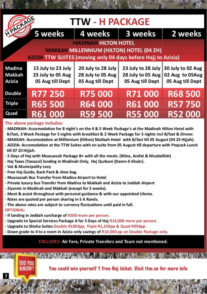 Disclaimer: Kindly check and confirm details with operators before booking. Package Information has been uploaded onto our website as received, and may have changed. Hotel Information has been sourced from websites like Google Maps, Wikimapia and Hotels.com. If any of the information is incorrect, kindly let us know via email: info@hajjumrahinfo.co.za - Shukran