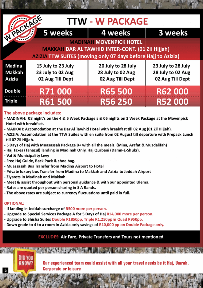 Disclaimer: Kindly check and confirm details with operators before booking. Package Information has been uploaded onto our website as received, and may have changed. Hotel Information has been sourced from websites like Google Maps, Wikimapia and Hotels.com. If any of the information is incorrect, kindly let us know via email: info@hajjumrahinfo.co.za - Shukran