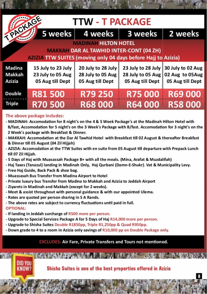 Disclaimer: Kindly check and confirm details with operators before booking. Package Information has been uploaded onto our website as received, and may have changed. Hotel Information has been sourced from websites like Google Maps, Wikimapia and Hotels.com. If any of the information is incorrect, kindly let us know via email: info@hajjumrahinfo.co.za - Shukran