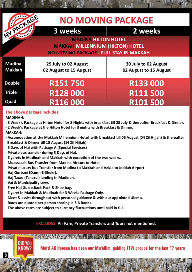 Disclaimer: Kindly check and confirm details with operators before booking. Package Information has been uploaded onto our website as received, and may have changed. Hotel Information has been sourced from websites like Google Maps, Wikimapia and Hotels.com. If any of the information is incorrect, kindly let us know via email: info@hajjumrahinfo.co.za - Shukran