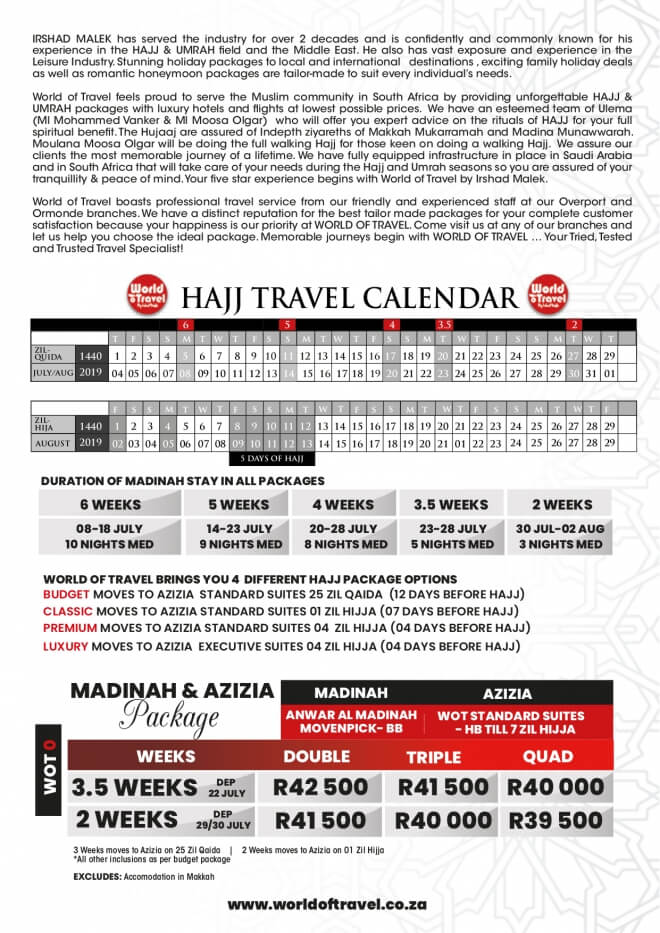 Disclaimer: Kindly check and confirm details with operators before booking. Package Information has been uploaded onto our website as received, and may have changed. Hotel Information has been sourced from websites like Google Maps, Wikimapia and Hotels.com. If any of the information is incorrect, kindly let us know via email: info@hajjumrahinfo.co.za - Shukran