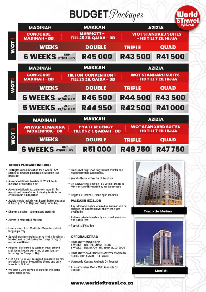 Disclaimer: Kindly check and confirm details with operators before booking. Package Information has been uploaded onto our website as received, and may have changed. Hotel Information has been sourced from websites like Google Maps, Wikimapia and Hotels.com. If any of the information is incorrect, kindly let us know via email: info@hajjumrahinfo.co.za - Shukran