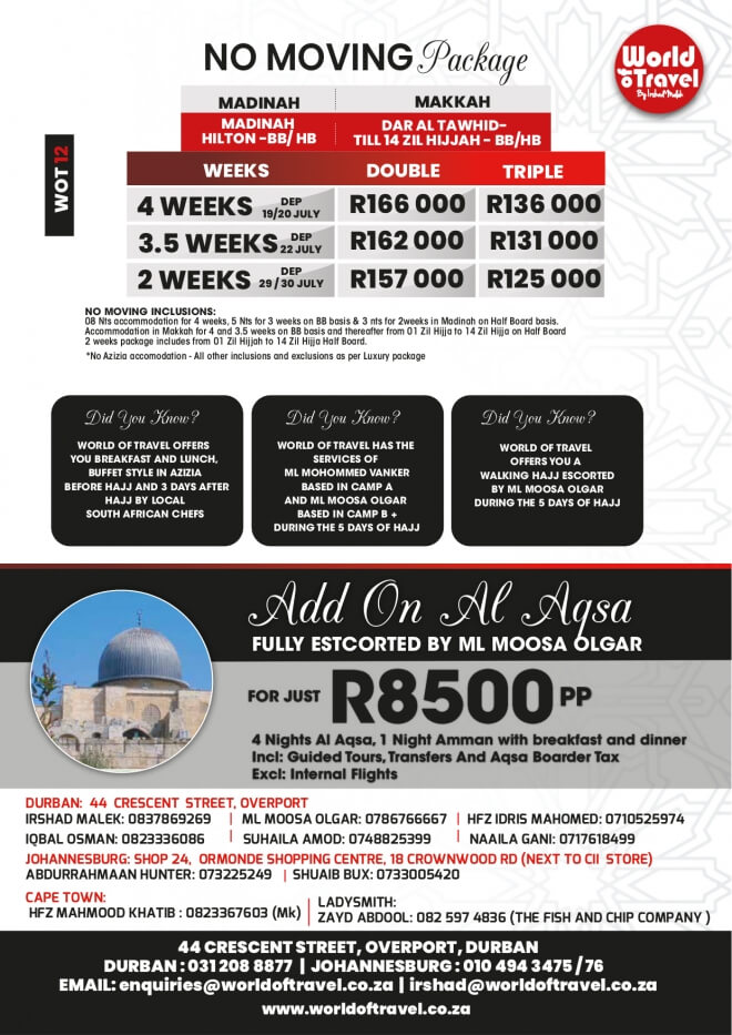 Disclaimer: Kindly check and confirm details with operators before booking. Package Information has been uploaded onto our website as received, and may have changed. Hotel Information has been sourced from websites like Google Maps, Wikimapia and Hotels.com. If any of the information is incorrect, kindly let us know via email: info@hajjumrahinfo.co.za - Shukran