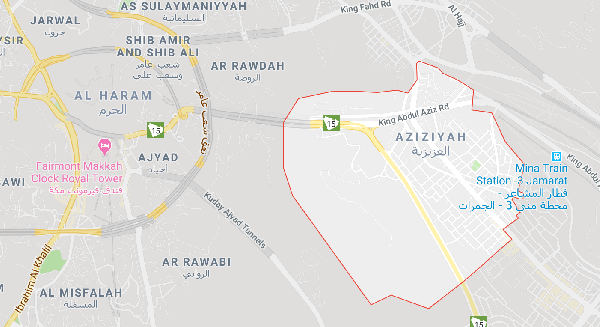 Azizia is a neighborhood of Mecca located about 8 kms from the Haram and a 10 minute drive.