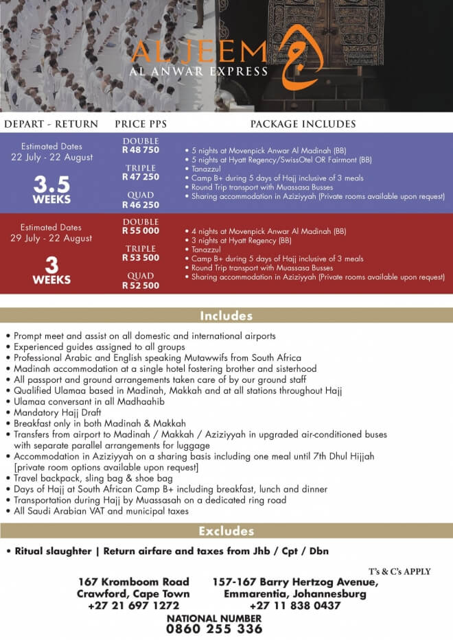 Disclaimer: Kindly check and confirm details with operators before booking. Package Information has been uploaded onto our website as received, and may have changed. Hotel Information has been sourced from websites like Google Maps, Wikimapia and Hotels.com. If any of the information is incorrect, kindly let us know via email: info@hajjumrahinfo.co.za - Shukran