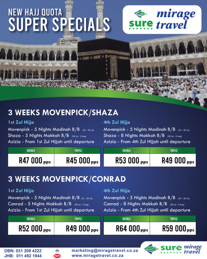 Disclaimer: Kindly check and confirm details with operators before booking. Package Information has been uploaded onto our website as received, and may have changed. Hotel Information has been sourced from websites like Google Maps, Wikimapia and Hotels.com. If any of the information is incorrect, kindly let us know via email: info@hajjumrahinfo.co.za - Shukran