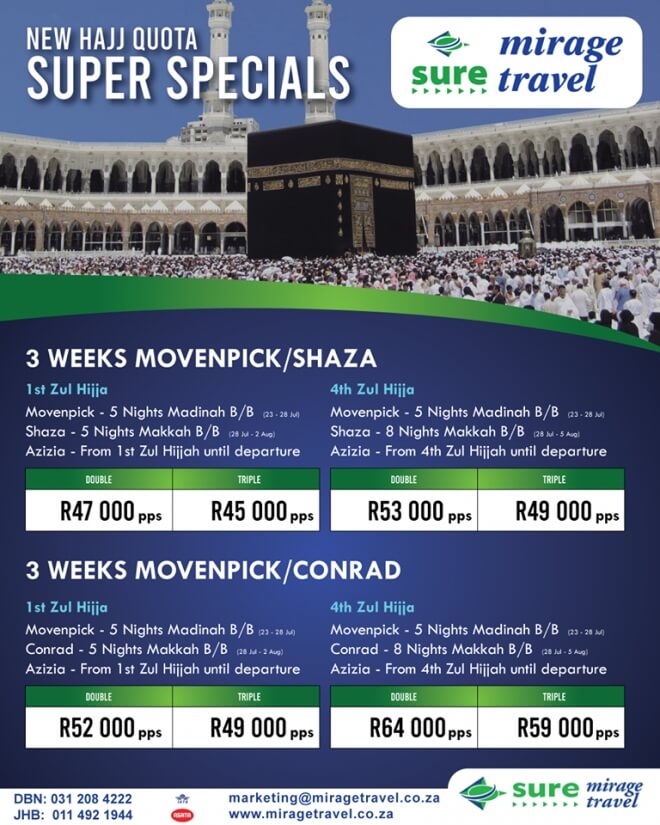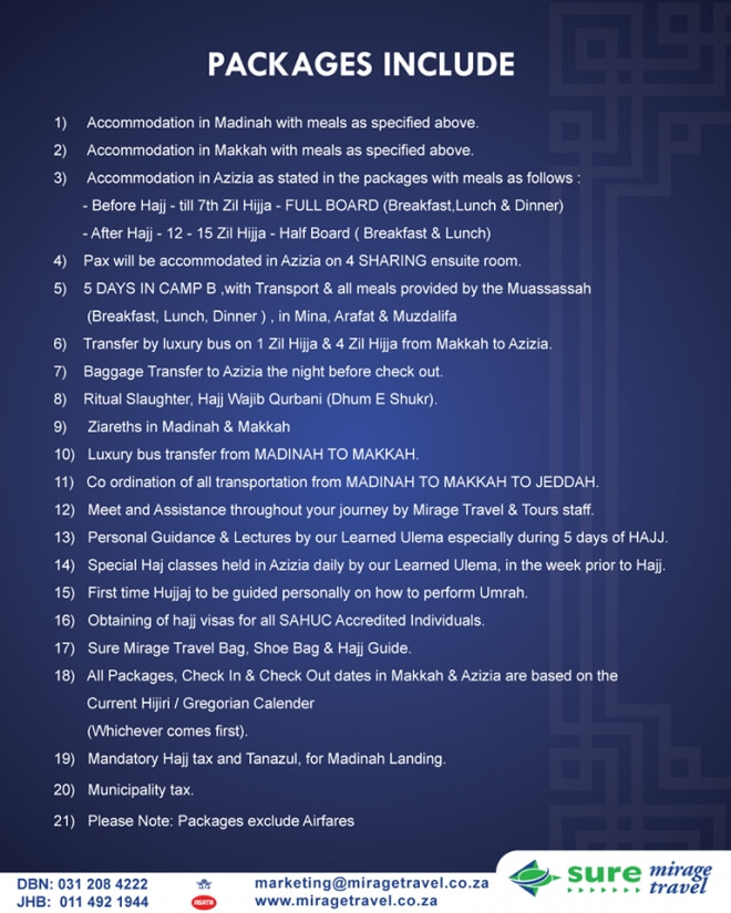 Disclaimer: Kindly check and confirm details with operators before booking. Package Information has been uploaded onto our website as received, and may have changed. Hotel Information has been sourced from websites like Google Maps, Wikimapia and Hotels.com. If any of the information is incorrect, kindly let us know via email: info@hajjumrahinfo.co.za - Shukran