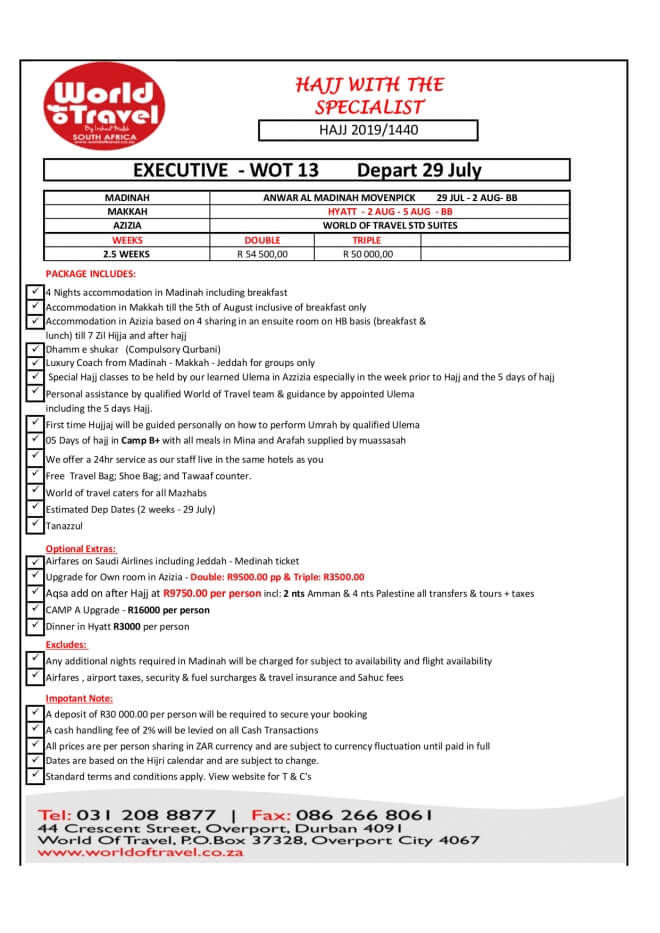 Disclaimer: Kindly check and confirm details with operators before booking. Package Information has been uploaded onto our website as received, and may have changed. Hotel Information has been sourced from websites like Google Maps, Wikimapia and Hotels.com. If any of the information is incorrect, kindly let us know via email: info@hajjumrahinfo.co.za - Shukran
