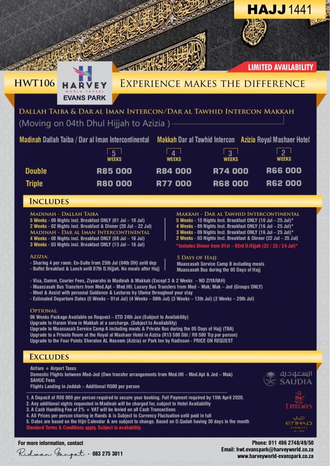 Disclaimer: Kindly check and confirm details with operators before booking. Package Information has been uploaded onto our website as received, and may have changed. Hotel Information has been sourced from websites like Google Maps, Wikimapia and Hotels.com. If any of the information is incorrect, kindly let us know via email: info@hajjumrahinfo.co.za - Shukran