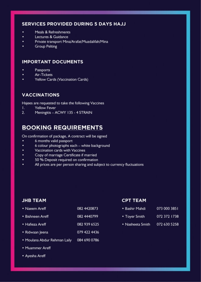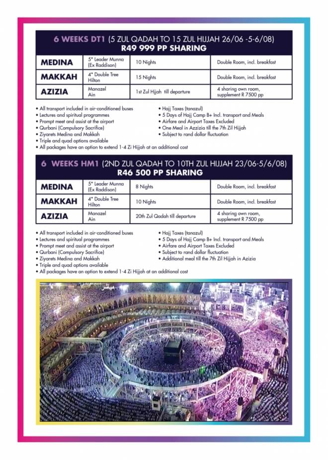 Disclaimer: Kindly check and confirm details with operators before booking. Package Information has been uploaded onto our website as received, and may have changed. Hotel Information has been sourced from websites like Google Maps, Wikimapia and Hotels.com. If any of the information is incorrect, kindly let us know via email: info@hajjumrahinfo.co.za - Shukran