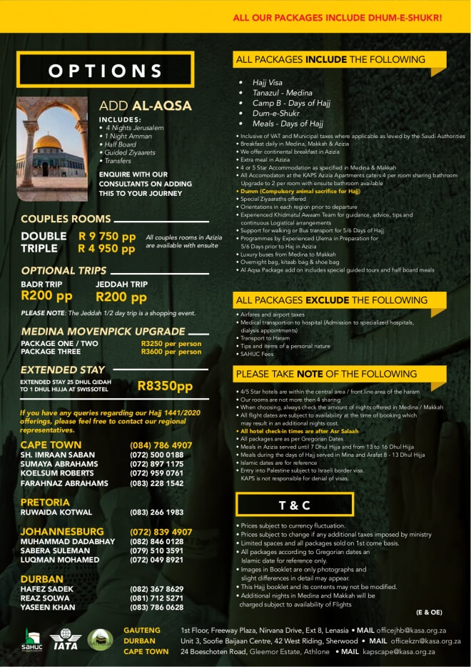 Disclaimer: Kindly check and confirm details with operators before booking. Package Information has been uploaded onto our website as received, and may have changed. Hotel Information has been sourced from websites like Google Maps, Wikimapia and Hotels.com. If any of the information is incorrect, kindly let us know via email: info@hajjumrahinfo.co.za - Shukran