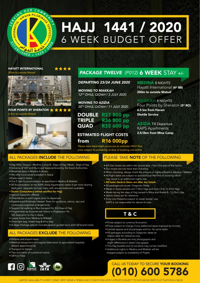 Disclaimer: Kindly check and confirm details with operators before booking. Package Information has been uploaded onto our website as received, and may have changed. Hotel Information has been sourced from websites like Google Maps, Wikimapia and Hotels.com. If any of the information is incorrect, kindly let us know via email: info@hajjumrahinfo.co.za - Shukran