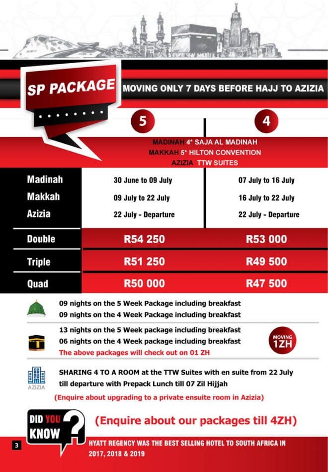 Disclaimer: Kindly check and confirm details with operators before booking. Package Information has been uploaded onto our website as received, and may have changed. Hotel Information has been sourced from websites like Google Maps, Wikimapia and Hotels.com. If any of the information is incorrect, kindly let us know via email: info@hajjumrahinfo.co.za - Shukran