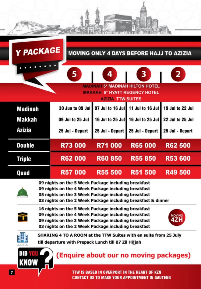 Disclaimer: Kindly check and confirm details with operators before booking. Package Information has been uploaded onto our website as received, and may have changed. Hotel Information has been sourced from websites like Google Maps, Wikimapia and Hotels.com. If any of the information is incorrect, kindly let us know via email: info@hajjumrahinfo.co.za - Shukran