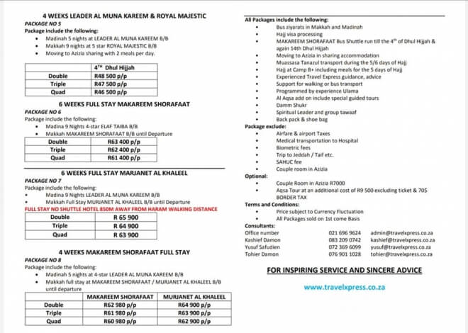Disclaimer: Kindly check and confirm details with operators before booking. Package Information has been uploaded onto our website as received, and may have changed. Hotel Information has been sourced from websites like Google Maps, Wikimapia and Hotels.com. If any of the information is incorrect, kindly let us know via email: info@hajjumrahinfo.co.za - Shukran