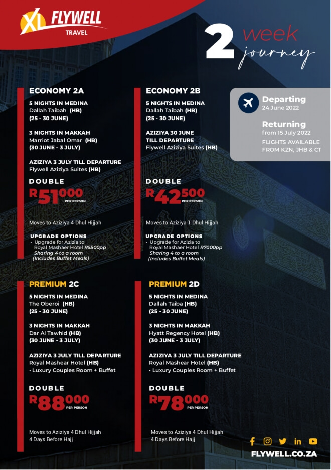 Disclaimer: Kindly check and confirm details with operators before booking. Package Information has been uploaded onto our website as received, and may have changed. Hotel Information has been sourced from websites like Google Maps, Wikimapia and Hotels.com. If any of the information is incorrect, kindly let us know via email: info@hajjumrahinfo.co.za - Shukran
