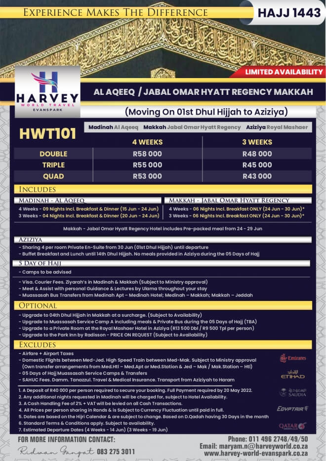 Disclaimer: Kindly check and confirm details with operators before booking. Package Information has been uploaded onto our website as received, and may have changed. Hotel Information has been sourced from websites like Google Maps, Wikimapia and Hotels.com. If any of the information is incorrect, kindly let us know via email: info@hajjumrahinfo.co.za - Shukran