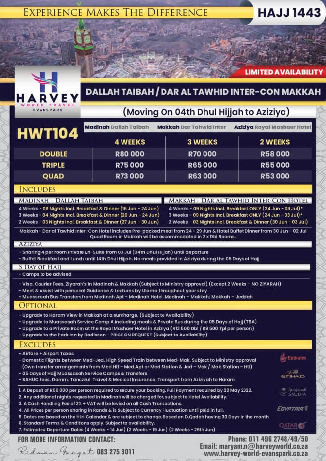 Disclaimer: Kindly check and confirm details with operators before booking. Package Information has been uploaded onto our website as received, and may have changed. Hotel Information has been sourced from websites like Google Maps, Wikimapia and Hotels.com. If any of the information is incorrect, kindly let us know via email: info@hajjumrahinfo.co.za - Shukran