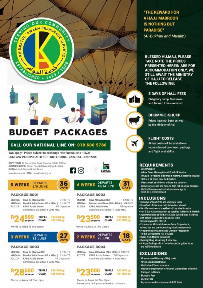 Disclaimer: Kindly check and confirm details with operators before booking. Package Information has been uploaded onto our website as received, and may have changed. Hotel Information has been sourced from websites like Google Maps, Wikimapia and Hotels.com. If any of the information is incorrect, kindly let us know via email: info@hajjumrahinfo.co.za - Shukran