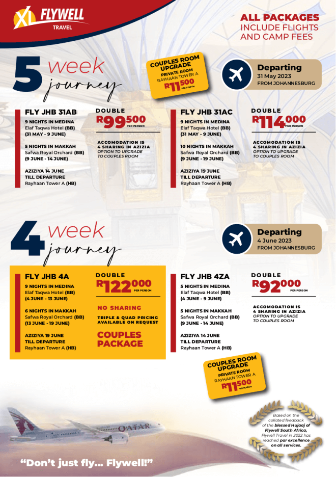 Disclaimer: Kindly check and confirm details with operators before booking. Package Information has been uploaded onto our website as received, and may have changed. Hotel Information has been sourced from websites like Google Maps, Wikimapia and Hotels.com. If any of the information is incorrect, kindly let us know via email: info@hajjumrahinfo.co.za - Shukran