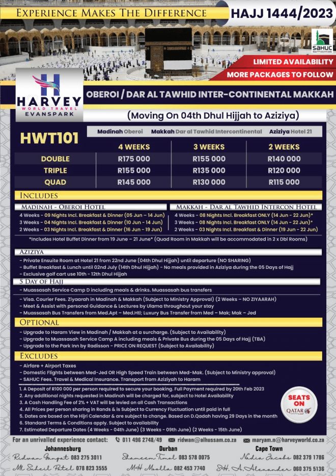 Disclaimer: Kindly check and confirm details with operators before booking. Package Information has been uploaded onto our website as received, and may have changed. Hotel Information has been sourced from websites like Google Maps, Wikimapia and Hotels.com. If any of the information is incorrect, kindly let us know via email: info@hajjumrahinfo.co.za - Shukran