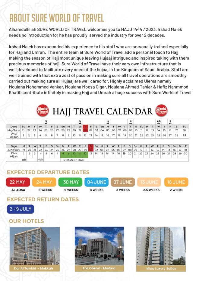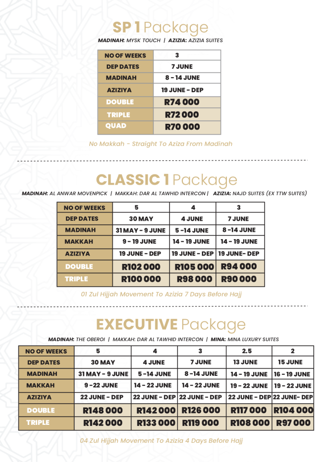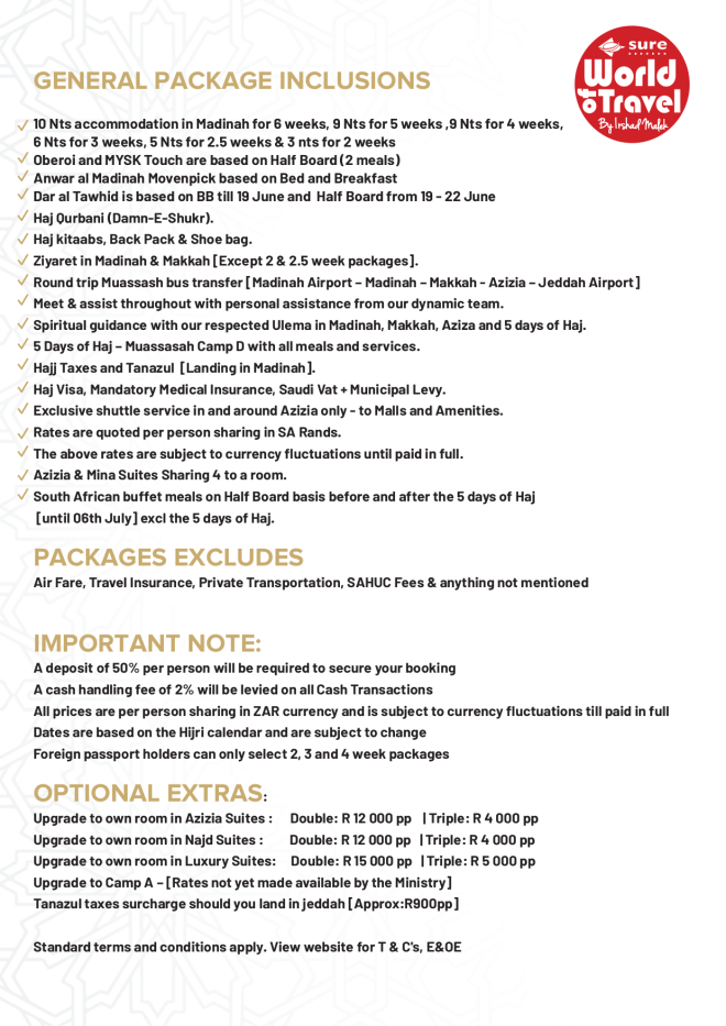 Disclaimer: Kindly check and confirm details with operators before booking. Package Information has been uploaded onto our website as received, and may have changed. Hotel Information has been sourced from websites like Google Maps, Wikimapia and Hotels.com. If any of the information is incorrect, kindly let us know via email: info@hajjumrahinfo.co.za - Shukran