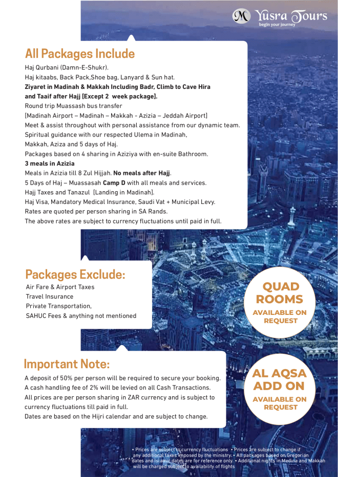 Disclaimer: Kindly check and confirm details with operators before booking. Package Information has been uploaded onto our website as received, and may have changed. Hotel Information has been sourced from websites like Google Maps, Wikimapia and Hotels.com. If any of the information is incorrect, kindly let us know via email: info@hajjumrahinfo.co.za - Shukran