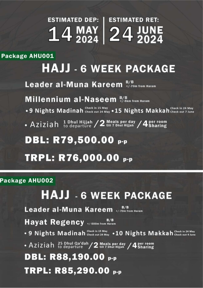 Disclaimer: Kindly check and confirm details with operators before booking. Package Information has been uploaded onto our website as received, and may have changed. Hotel Information has been sourced from websites like Google Maps, Wikimapia and Hotels.com. If any of the information is incorrect, kindly let us know via email: info@hajjumrahinfo.co.za - Shukran