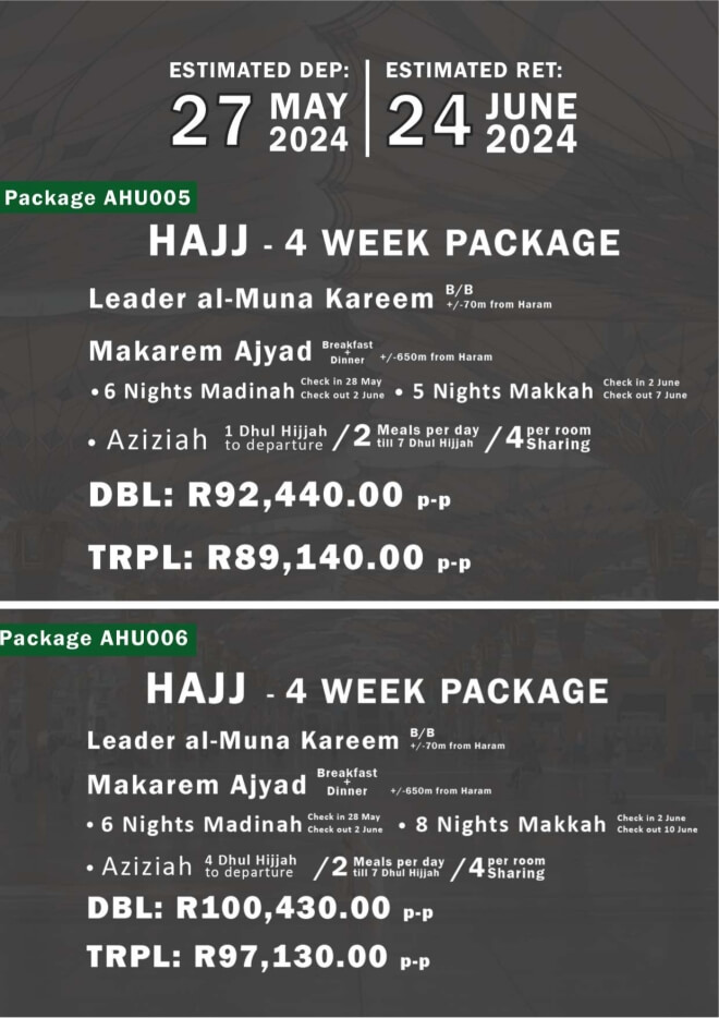 Disclaimer: Kindly check and confirm details with operators before booking. Package Information has been uploaded onto our website as received, and may have changed. Hotel Information has been sourced from websites like Google Maps, Wikimapia and Hotels.com. If any of the information is incorrect, kindly let us know via email: info@hajjumrahinfo.co.za - Shukran