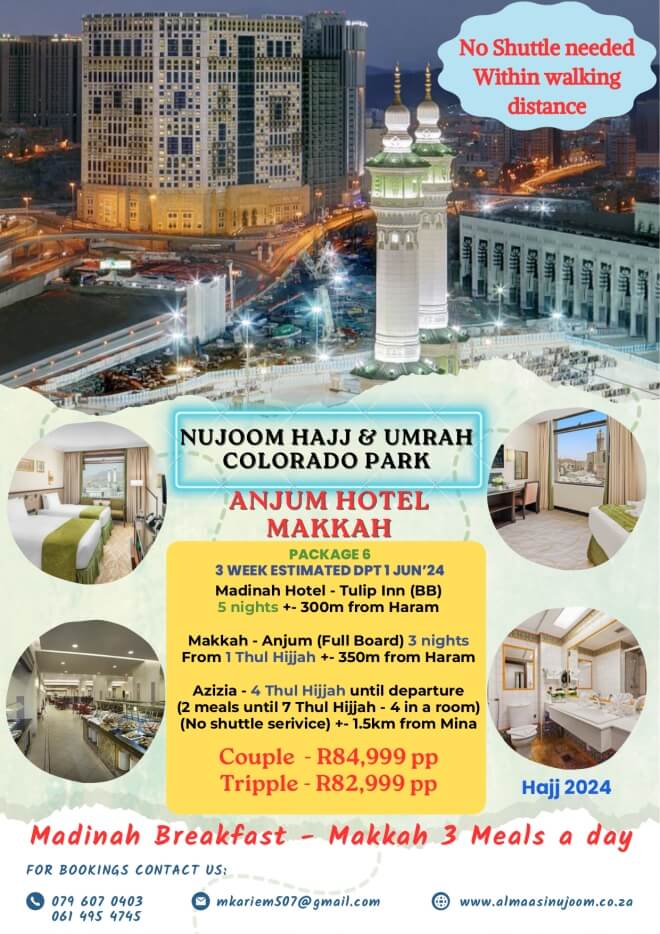 Disclaimer: Kindly check and confirm details with operators before booking. Package Information has been uploaded onto our website as received, and may have changed. Hotel Information has been sourced from websites like Google Maps, Wikimapia and Hotels.com. If any of the information is incorrect, kindly let us know via email: info@hajjumrahinfo.co.za - Shukran