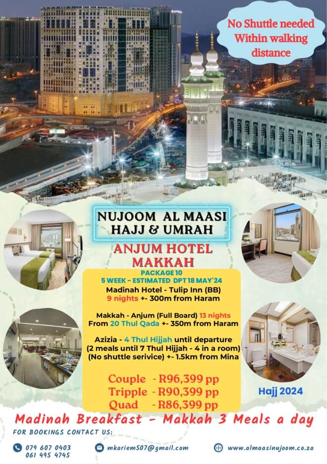 Disclaimer: Kindly check and confirm details with operators before booking. Package Information has been uploaded onto our website as received, and may have changed. Hotel Information has been sourced from websites like Google Maps, Wikimapia and Hotels.com. If any of the information is incorrect, kindly let us know via email: info@hajjumrahinfo.co.za - Shukran