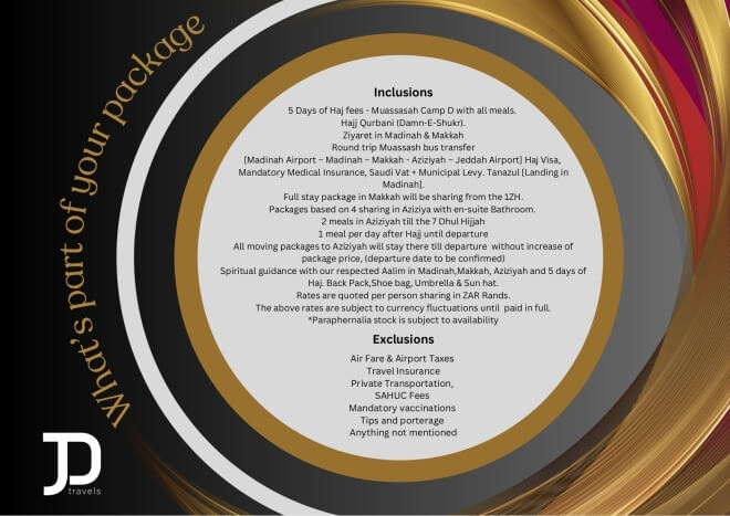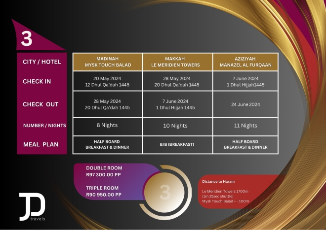 Disclaimer: Kindly check and confirm details with operators before booking. Package Information has been uploaded onto our website as received, and may have changed. Hotel Information has been sourced from websites like Google Maps, Wikimapia and Hotels.com. If any of the information is incorrect, kindly let us know via email: info@hajjumrahinfo.co.za - Shukran