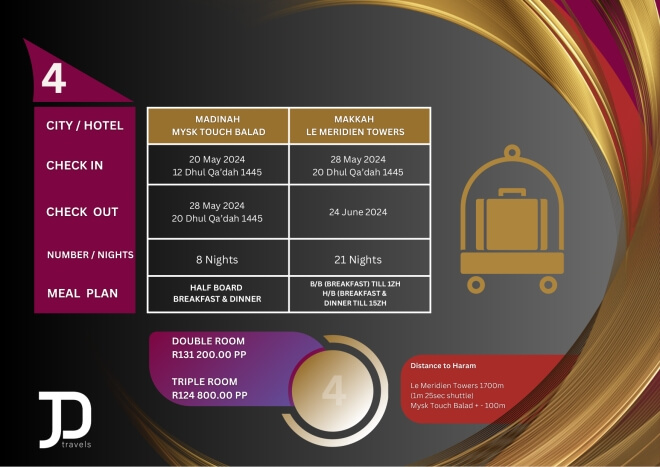 Disclaimer: Kindly check and confirm details with operators before booking. Package Information has been uploaded onto our website as received, and may have changed. Hotel Information has been sourced from websites like Google Maps, Wikimapia and Hotels.com. If any of the information is incorrect, kindly let us know via email: info@hajjumrahinfo.co.za - Shukran